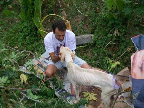 Câinele cântărea atunci circa 13 kilograme şi avea o rană foarte mare şi infectată, în zona dorsală. Tot scheletul i se vedea prin piele, iar mersul era atât de dureros încât câinele abia se ridica să-şi facă nevoile.