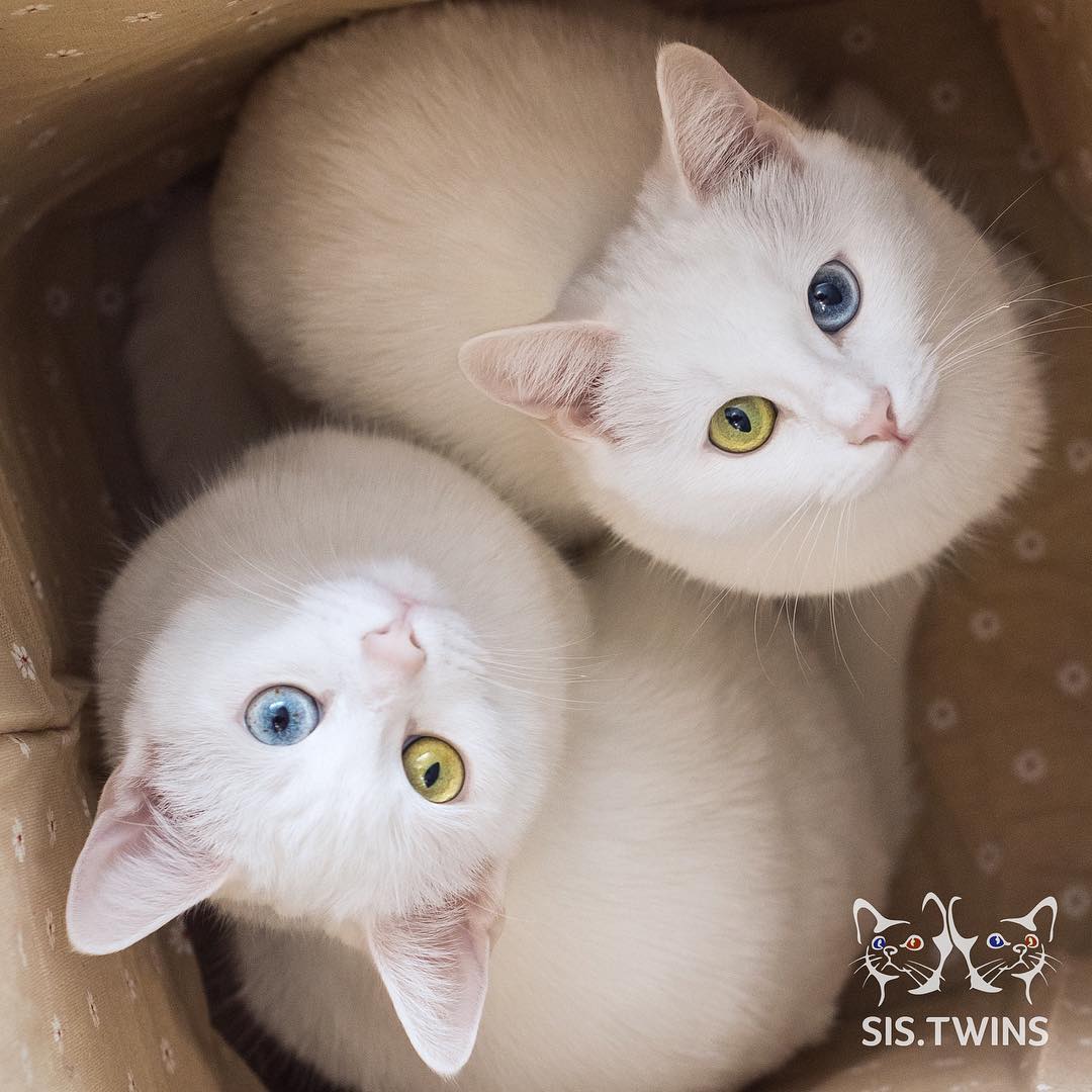 Cele două au heterocromie, o anomalie congenitală care afectează nivelul de melanină din iris. Deoarece melanina este răspunzătoare cu culoarea ochilor atât la om, cât şi la animale, diferenţele de nivel din globul ocular al pisicii au un efect uimitor şi captivant.