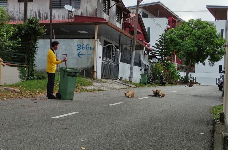 Povestea următoare s-a petrecut în Malaezia, acolo unde un bărbat care își câștigă existența măturând străzile, a făcut un gest cu totul de apreciat față de animalele de companie. El își desfășoară activitatea zilnică alături de cei doi câini adorabili, pe care i-a adoptat și cărora le oferă multă dragoste, indiferent de dificultățile cu care se confruntă.