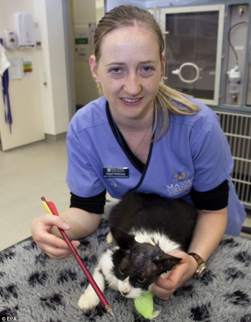 Moo Moo, un pisoi din Noua Zeelandă, a avut parte de o experiență extrem de traumatizantă. Dispărută de acasă, felina a fost găsită de stăpână sa, într-un tufiș, cu o săgeată înfiptă în cap. Pisoiul a fost dus la spital, iar medicul veterinar a reușit să-i extragă săgeata și să-i salveze viața.