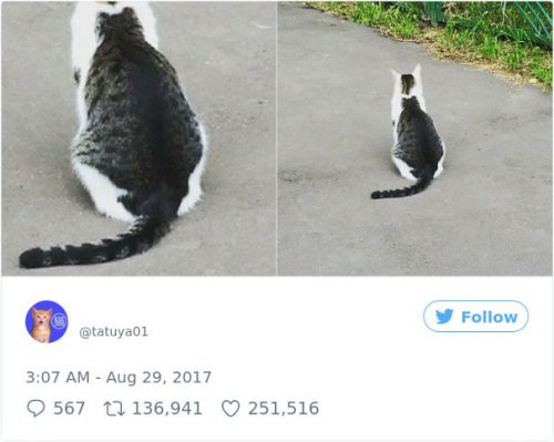 Un bărbat a observat această pisică, a împărtășit fotografiile surprinse de el pe Twitter și felina cu marca unică pe spate a devenit virală în toată lumea.Un utilizator japonez de Twitter a văzut o felină care avea ”tatuată” o altă pisică ce îi acoperea spatele.Imaginea surprinsă a fost publicată în rețeaua socială la sfârșitul lunii august și a fost vizualizată de peste 250 de mii de ori și distribuită de încă 136 de mii.