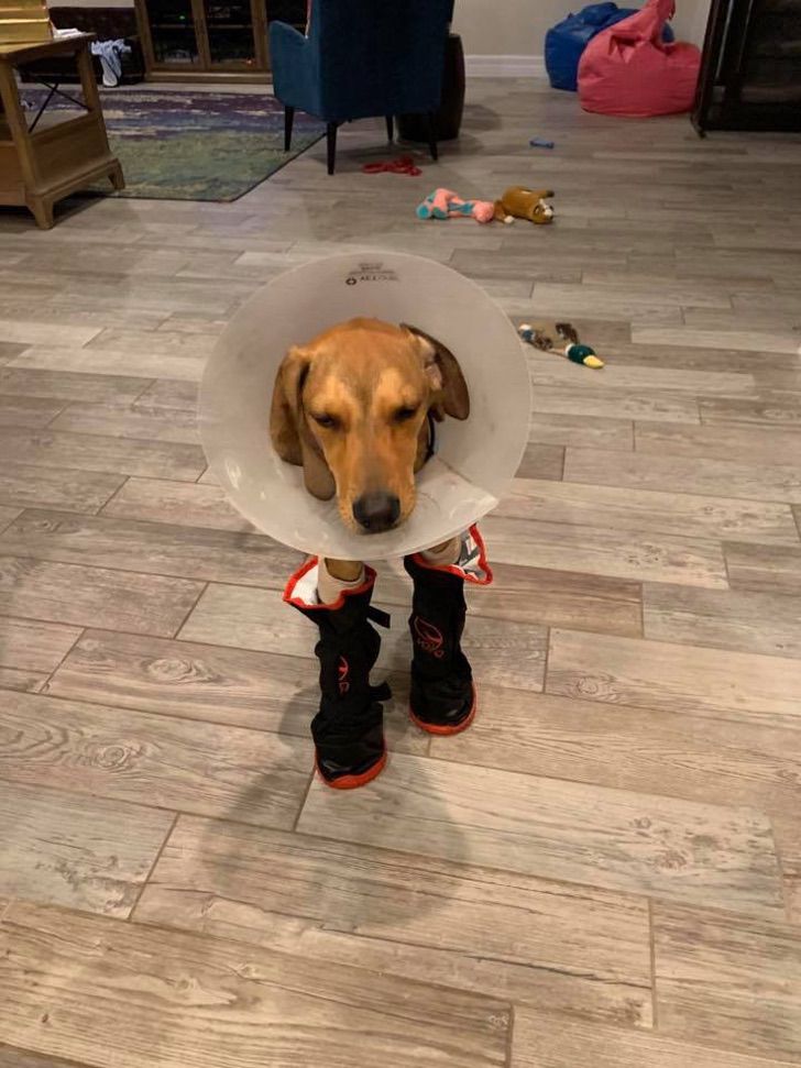 Nu a durat mult până când căţeluşul şi-a recâştigat greutatea şi blana, dar a trebuit să poarte un guler în formă de con.
