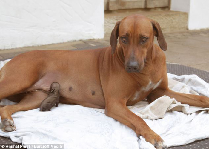Acesta a fost plasat în grija căţeluşei, care bucuroasă a acceptat să-l îngrijească exact ca pe unul de-al ei.