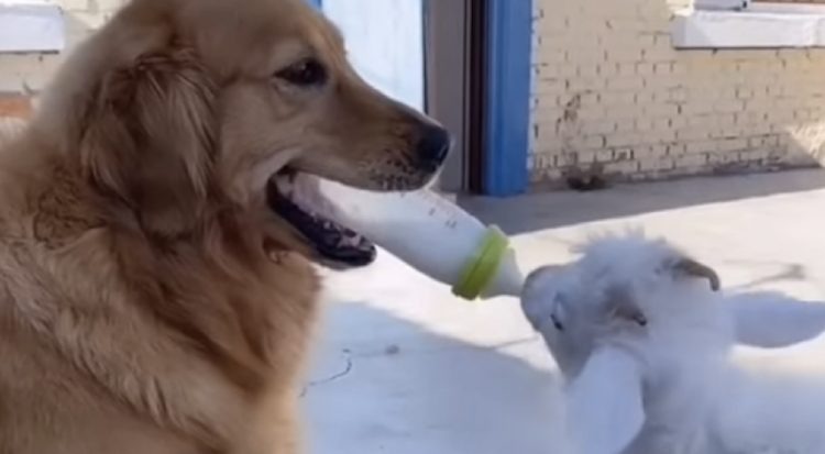 O cățelușă Golden Retriever a fost surprinsă în timp ce îngrijea un ied orfan!