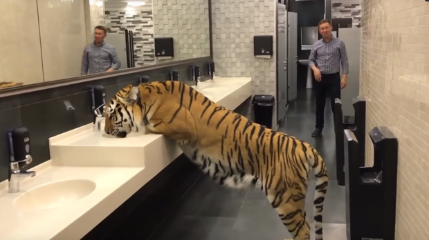 Ce se întâmplă când o tigroaică intră în toaleta bărbaților, undeva în Moscova! Atunci când spui tigru, te gândești automat la la o fiară capabilă să te omoare în orice clipă, dar uite că există și excepții.Tigroaica Chanel de 7 ani, ce aparține unui circ din Moscova, a căpătat un obicei ciudat. Ea a găsit o modalitate mai simplă prin care să-și potolească setea. Chanel intră în toaleta bărbaților, se urcă pe chiuvetă şi bea apă, liniştită, direct de la chiuvetă. Acest fapt este o realitate, după cum demonstrează o înregistrare urcată recentă pe canalul de Youtube.Evident că bărbatul care a întâlnit-o a fost şocat, însă felina este nepăsătoare şi îşi vede mai departe de treabă.Lucruri neștiute despre cele mai frumoase feline: