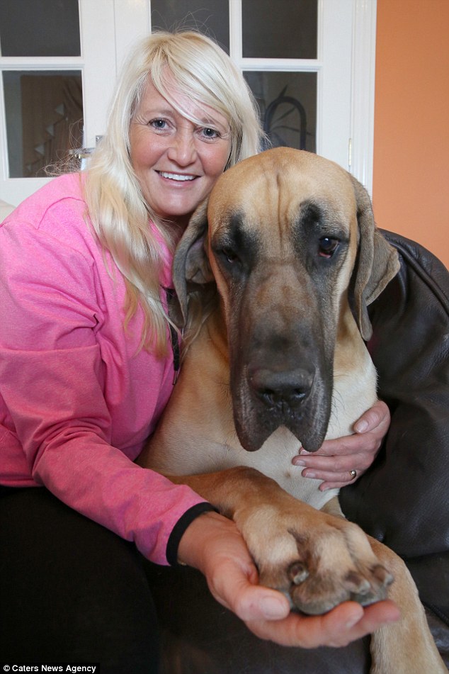 Sian Barrett, in varsta de 47 de ani din Oldbury, Anglia, spune ca Presley, un caine din rasa Marele Danez, se teme de catei mai mici decat el si fuge in momentul in care trebuie sa infrunte alte animale.